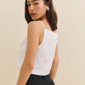 Description & Key Features Cropped, sleeveless linen top with a square/apron-style neckline. Made of 100% lightweight linen. Lined and designed to have a slim, slightly cropped fit. Care instructions: Wash cold and line dry. Fit & Style Fitted and cropped — sits shorter than a standard top, pairs well with high-waisted skirts or pants. Breezy and suitable for warm weather, offering a casual yet chic look.