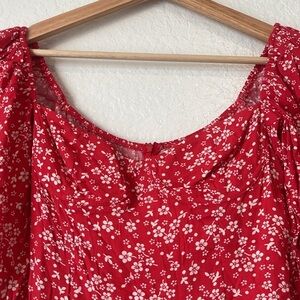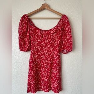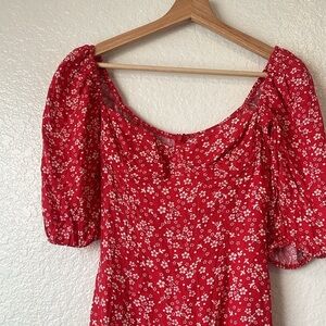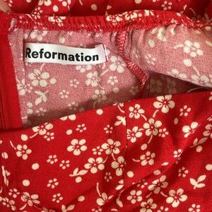 Reformation Kopa Dress Mini length dress with a sweetheart neckline and short sleeves. The Kopa is fitted in the bodice with an easy fitting skirt. Elastic at shoulders. Underwire bodice detail. Lined bodice. Unlined skirt. 53% viscose & 47% rayon.