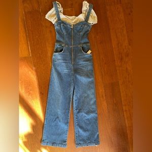 Reformation kora denim jumpsuit size 2 BNWT. Please see photo measurements . Straps have three holes to choose length . Runs more like a 0 . Top under jumpsuit in photos is not included. This fits just like how the model is fitting .