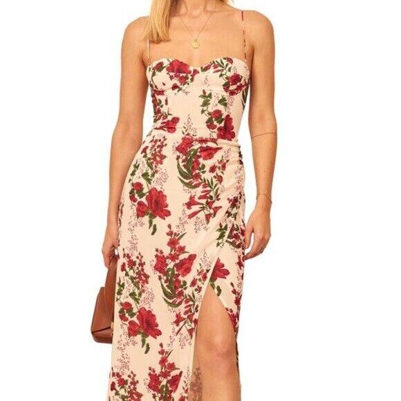 Reformation Kourtney Red Green Floral Woven Sleeveless Midi Dress Slit Size 8