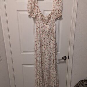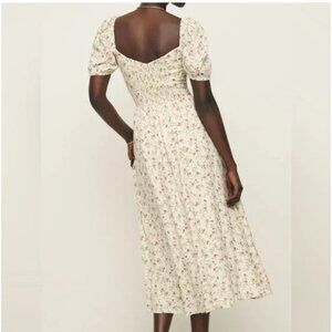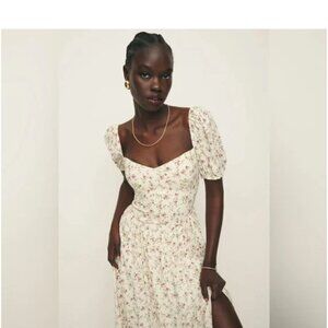 Ladonna Dress from Reformation, a midi length dress, with puff sleeves, a sweetheart neckline, and a side slit.
