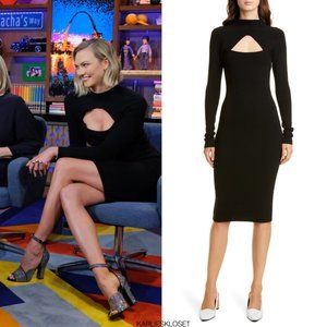 This is Eco ghost crepe, knee length dress featuring a cutout open front sweetheart neckline/bodice with twisted detail at the top. Very Flattering fitted shape.