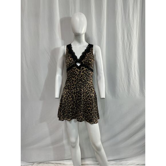 Chic leopard print dress. Features black lace trim. Sleeveless design.