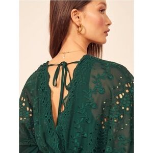 This is a midi length dress with an overlapping v neckline, lace trim and kimono sleeves. The Libbie has an elastic waistband and an easy fitting skirt.