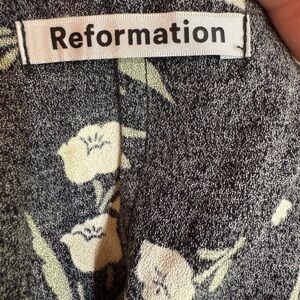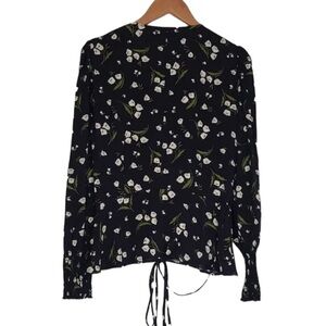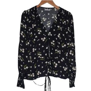 Reformation puff sleeve wrap blouse in a romantic black and white Lily of the Valley floral print. Features a deep v-neckline, adjustable waist tie, and lightly puffed long sleeves with smocked cuffs for a flattering, feminine silhouette. Crafted from a soft eco-friendly blend of viscose and rayon. Size Small.