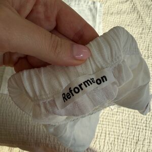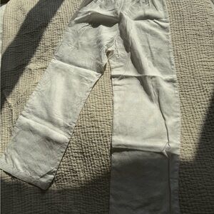 Casual linen joggers with drawstring waist. Straight-leg silhouette for relaxed wear. Lightweight, breathable fabric ideal for warm days. Neutral cream shade pairs easily with many tops. Good for 5'8 and below
