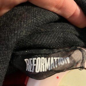Figure flattering Reformation tie waist long coat. This coat has been gently used and has no rips, stains or tears. It feels like a wool blend, but Reformation uses a lot of remnant and upcycled fabrics, so the exact fabric content is unknown. This outerwear has a tailored and fitted look to it. Lovely dark grey to compliment any color combination.