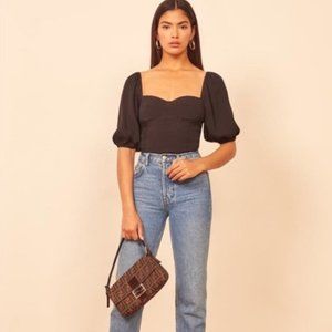 Reformation Lua Puff Sleeve Top, Black, Size 0
