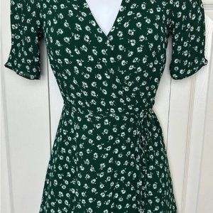 Chive green & white floral clover material, vneck with snap closure, wrap tie waist, short sleeves and wrap style. In excellent condition.