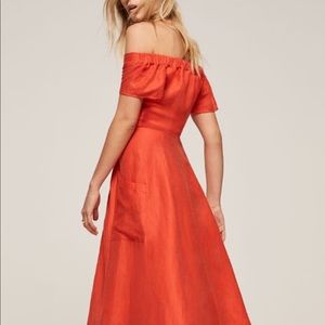 This is an off-the-shoulder, midi length dress with center front buttons and pockets. Fruit punch (red/orange) color. Never worn and comes with the original Reformation garment bag. Size 0. There is little to no stretch with this fabric and this item runs slightly small.