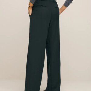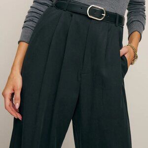 belt loops, front buttons, finished hem, pleated details, side pockets, and zipper fly.