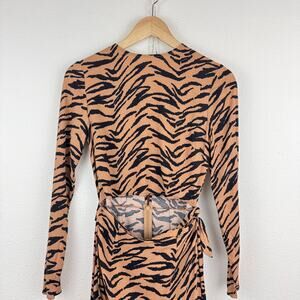 Tan & black zebra print, long sleeves, keyhole button back, wrap skirt with tie closure, front center slit at midriff, size 2.