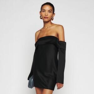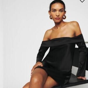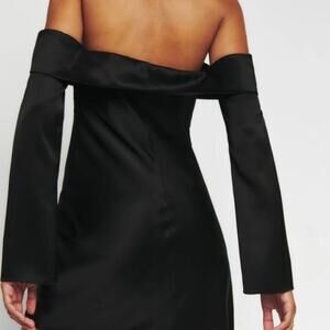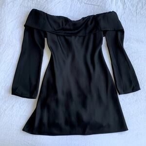 Reformation Maves Satin Silky Off The Shoulder Long Sleeve Mini Dress Black