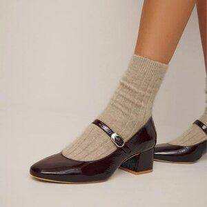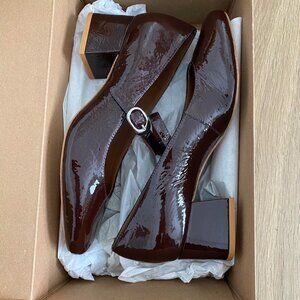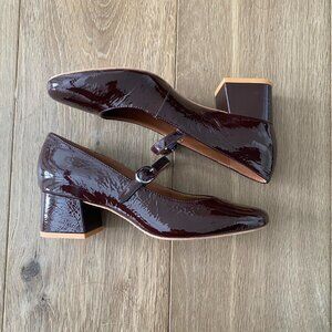 Reformation Max Block Heel in Rum Raisin Crinkle Patent