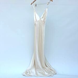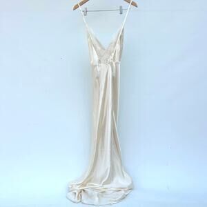 This Reformation Maysen silk gown is the ultimate in timeless elegance. Crafted from luxurious Fior Di Latte ivory silk with a delicate lace-trimmed neckline, it’s the perfect choice for a modern bride or formal evening affair. The open back and long fluid cut create a flattering drape that captures both sophistication and romance. Ideal as a wedding dress, reception dress, or upscale event gown, this piece embodies effortless glamour. A versatile investment for special occasions and forever style.