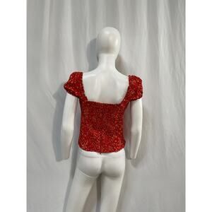Reformation 'Micaela' Red Viscose Top Size 6: lightweight low-stretch crepe, ruffle sweetheart neckline with tie detail, cap sleeves with elastic cuffs, hidden zip and smocked elastic at back, floral print.