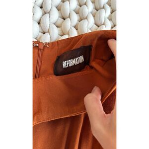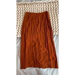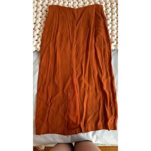 Burnt orange / terra cotta color. Front slit feature. Designed to be fitted at bodice with an A-line skirt.