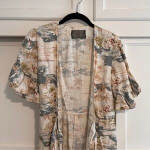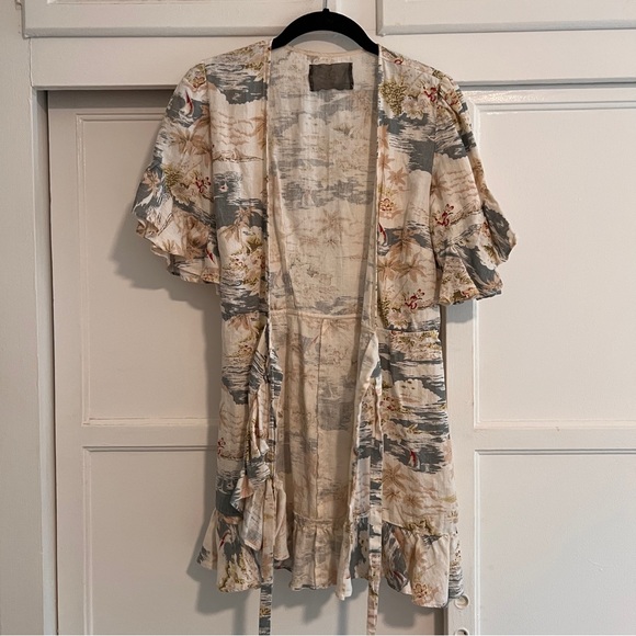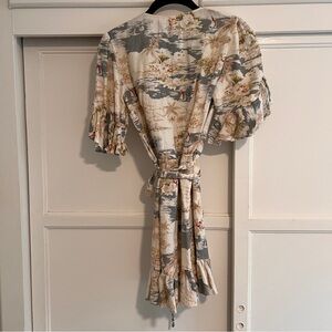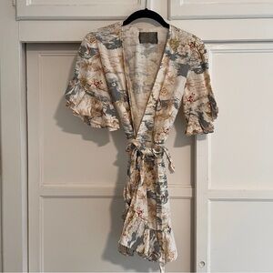 100% linen mini dress with ruffle detail at the sleeve and bottom. Wrap around dress