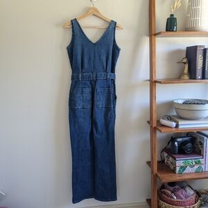 Chic, sleeveless denim jumpsuit with a tie-front waist. Contains both front and back pockets. Hidden zippered front makes it easy to slip into when you're crunched for time but still want to look put-together. Sturdy and stretchy denim material - SO comfy and flattering. Perfect for a date night or girl's night out. Excellent condition.
