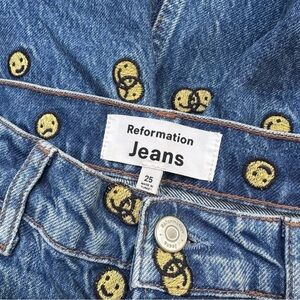 Reformation Mixed Emotions High Rise Straight Jean Smiley Face Blue Denim 25