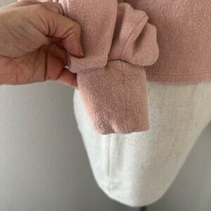 This light pink Reformation pullover sweater features a chic mock neck and elegant pleated long balloon sleeves. Made in the USA, it offers a comfortable fit with a sustainable blend of Tencel, organic cotton, and spandex. Ideal for effortless, stylish layering.