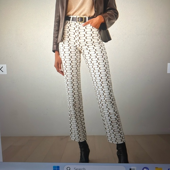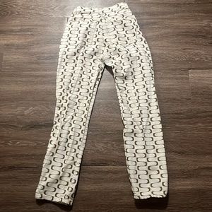 Cute white jeans with brown squiggle details. Runs closeish to size but would say these fit more like a 25. These have been worn only twice and in great condition. Very soft denim fabric and flattering on body.