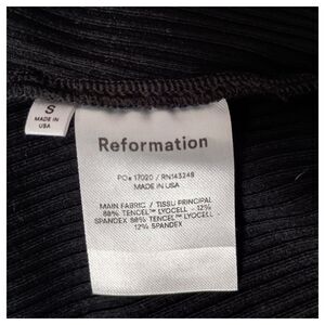The Reformation Molly Knit Skirt in small size and black color is a stylish midi-length skirt made from a lyocell blend material. It features a solid pattern with ribbed accents, pull-on closure, and pockets for added convenience. This A-line skirt is perfect for casual occasions during the summer, fall, or spring seasons. Made in the United States, this skirt exudes a trendy yet effortless vibe, making it a versatile addition to any woman's wardrobe. Waist: 24", Length: 30"