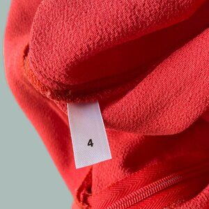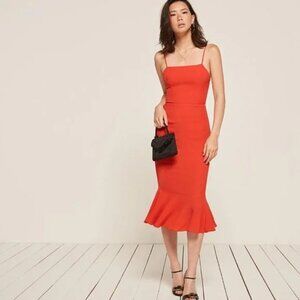 Reformation Moxie dress in a bright coral color. Curve hugging fit with flared trumpet skirt and adjustable spaghetti straps.