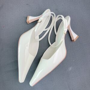 Reformation Natasha Pumps in glossy white patent leather, size 7. Brand new without box. Designed with a pointed toe, sleek slingback strap, and a modern low block heel that adds height while staying comfortable. The clean white finish makes these perfect for bridal events, spring outfits, graduations, and polished everyday looks. A timeless, elegant style that pairs effortlessly with dresses and tailored pieces.