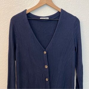 Stylish navy mini dress. Features button-down front. Long sleeves. Perfect for any occasion.