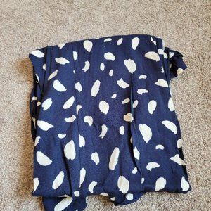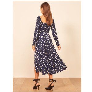 Elegant navy midi dress with white abstract pattern. Features long sleeves and square neckline. Perfect for any occasion.