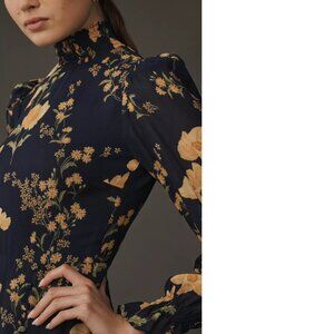 Elegant navy midi dress with yellow floral pattern. Features long sleeves and a high slit. Perfect for any occasion.