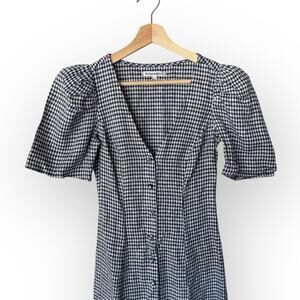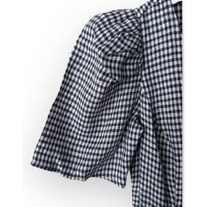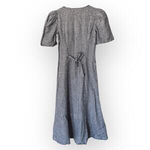 A midi length dress with a V neckline and short puffed sleeves. Features a button front and ties at the back waist, so you can adjust it to your liking. Fitted in the bodice with a relaxed fitting skirt, so you can get structure and comfort all in one.
