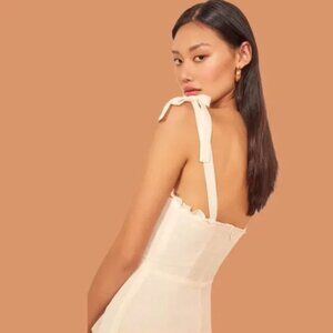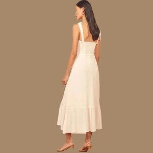 Ankle alert. The Nikita is fitted in the bodice and waist with a relaxed fitting skirt. This midi length dress has a ruffle edged neckline, adjustable strap ties, and a trumpet skirt. It gives you a pretty good balance of comfort and shape.