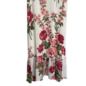 Reformation Nikita Floral Dress in Ivory/Floral size 0. Stroll along city streets or twirl across the dance floor in this flirty midi dress fashioned with ruffled trim at the sweetheart neck and a swishy skirt.