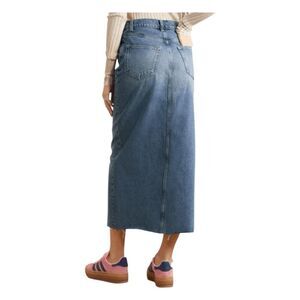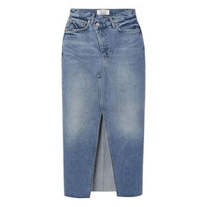 Reformation Nila Denim Midi Skirt Blue Medium Wash Asymmetric Distressed Hem 27