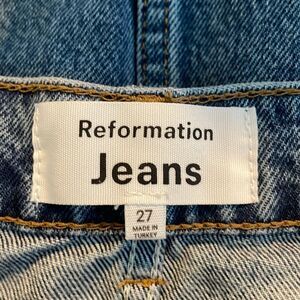 Reformation Nila Midi Jean Skirt is made from a Medium Wash Denim. It falls to a slim midi length and is accented by an asymmetric front slit. It has a Dipped Waist with a Button, Zipper Closure. It is finished frayed edges for an upcycled-inspired look.