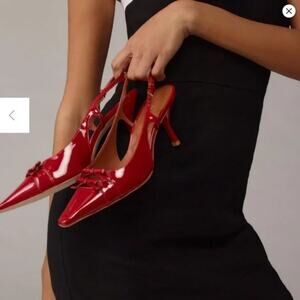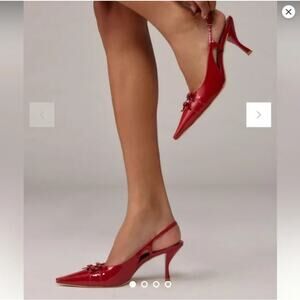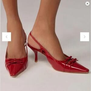 New without box. The Noreen heels feature glossy red leather, a pointed toe with bow detail, and adjustable slingback strap. Perfect for date night, parties, or special events. Leather upper and insole, rubber sole. Heel height: 3”. Size 7.5.