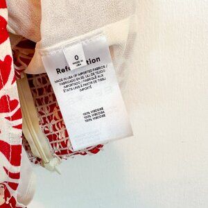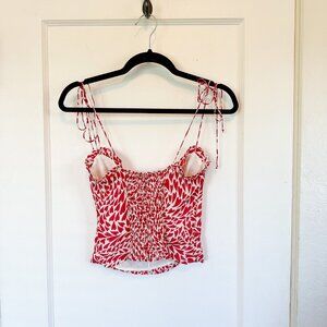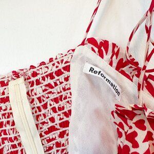 The Novena top from Reformation features a romantic sweetheart neckline with adjustable tie straps and a fitted bodice that flatters the waist. Fully smocked in back for comfortable stretch and finished with soft ruffle trim and a hidden back zip. Made from lightweight viscose in the "Hearts Love" red-and-white floral print — feminine and versatile for date nights, concerts, and summer outings.