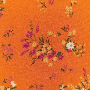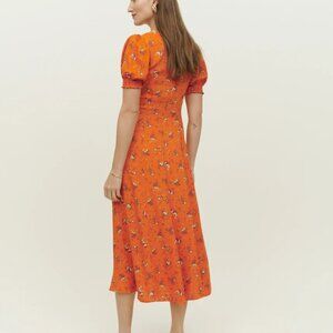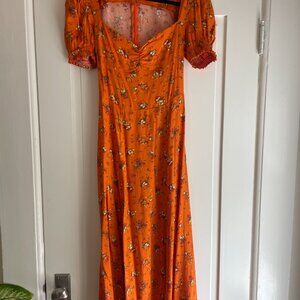 Vibrant orange midi dress with floral pattern. Features puff sleeves and square neckline. Perfect for any occasion.