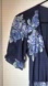 Oversized navy blue, white, and blue floral print. Short puff sleeves with elastic cuffs, wrap, unlined, maxi length. Feminine, contemporary, wedding guest, events, modest, cocktail