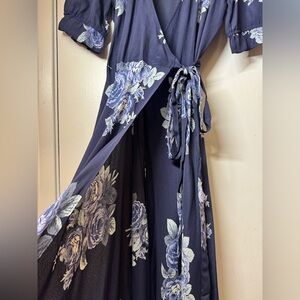 Reformation Oversized Floral Navy Blue Maxi Short Sleeves Wrap Cocktail Dress