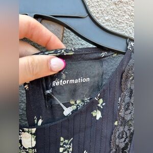 Reformation long dress with short sleeves. Lace detail. Floral print. Back zipper