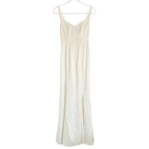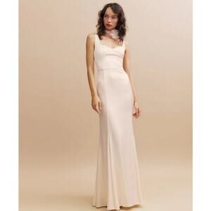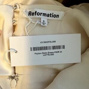 Reformation Payton Satin Dress Fior Di Latte. Size 0. Features fitted bodice, sweetheart neckline, non-adjustable shoulder straps, relaxed skirt, lined, back button and zipper with hook and eye closure, long maxi floor length. 88% NAIA renew acetate, 12% polyester. Style 1313933. NWT / New with tags, very faint run on bodice as photographed. Sold as is.