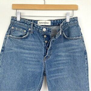Reformation Petite Mid Crop Flare Jeans Size 28 Petite This is a cropped, mid rise, rigid jean with a flared leg and subtle distressing. - cropped leg - subtly flare silhouette - rigid denim - mid rise - raw hem Approximately measurements Waist 14” Rise 10.5” inseam 20” Condition: Preloved, no rips, holes, tears or stains. stock photo is just for reference. No modeling, No trades or holds please. T 0910