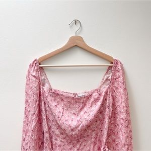 Charming pink dress with floral pattern. Features a square neckline and long sleeves. Perfect for a casual outing.
