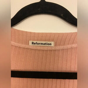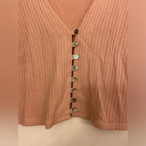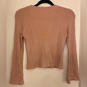 Elegant pink long sleeve top. Features button-down front. Soft and stylish.