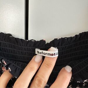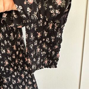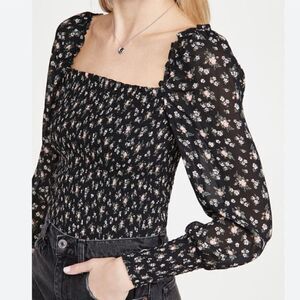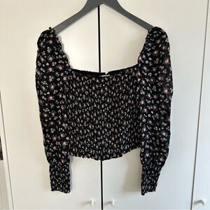 Can be worn on or off the shoulder, elastic at shoulders, hip length, ruffle edged shoulder, slim fitting bodice, smocked bodice, smocked cuff, square neck, and strapless bra friendly.