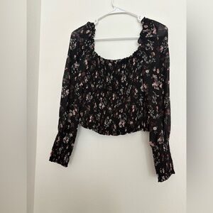 Chic black blouse with floral pattern. Long sleeves with gathered cuffs. Perfect for stylish outings.