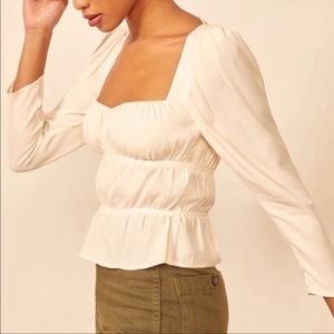 Size small Plath too by Reformation in ivory/cream. Square neckline with puff sleeves. Banded bodice with shirring. Vented back hem. Tie back detail. Great gently used condition!